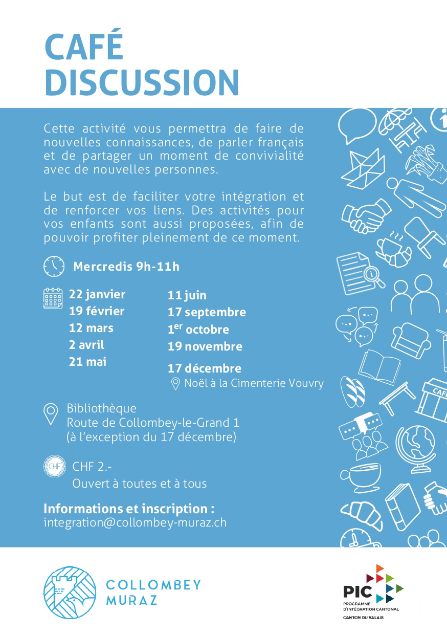 Un espace de discussion, ouvert à toutes personnes intéressées - qu'elles soient issues de la migration ou non. Se rencontrer, créer le lien, échanger en français autour d'une thématique en lien avec la santé, l'éducation ou l'intégration dans une ambiance conviviale avec un café-croissant; tel est l'objectif de cette mesure.