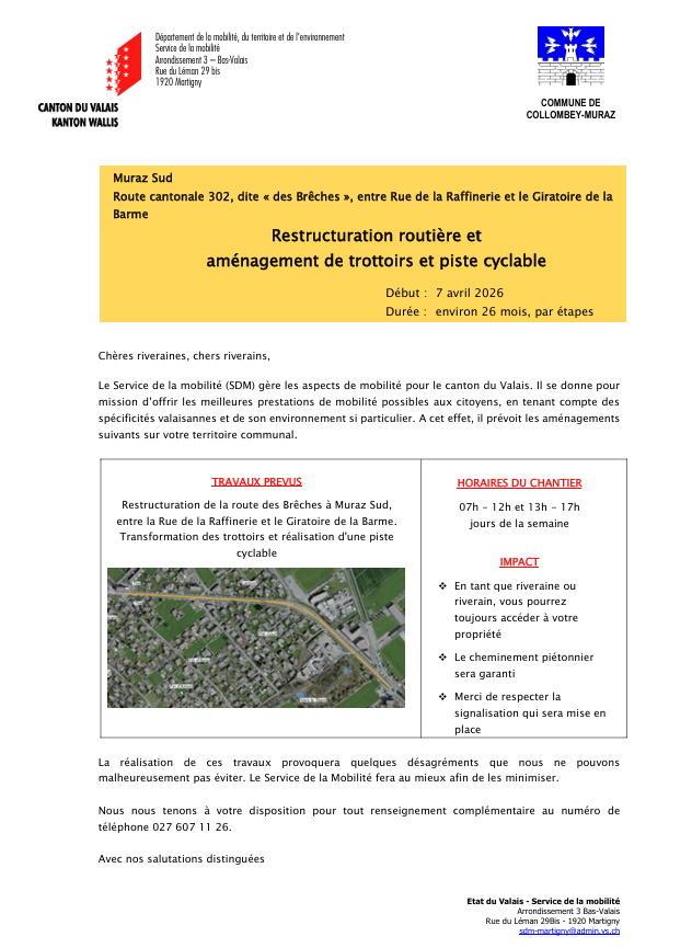 > Services communaux > Avis communaux > Actualités Commune > Travaux RC302-Muraz sud: Restructuration routière et aménagement de trottoirs et piste cyclable
